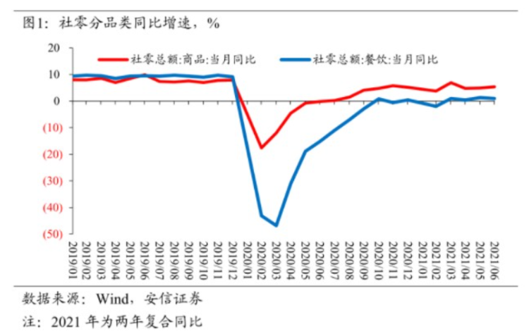 从去年消费的情况来看,去年下半年随着国内疫情相对彻底的控制,居民部门消费倾向持续抬升,并推动消费数据加速恢复。但这一过程似乎从今年以来陷入停滞,今年上半年消费倾向在比疫情前更低的水平上企稳,消费数据的表现类似。