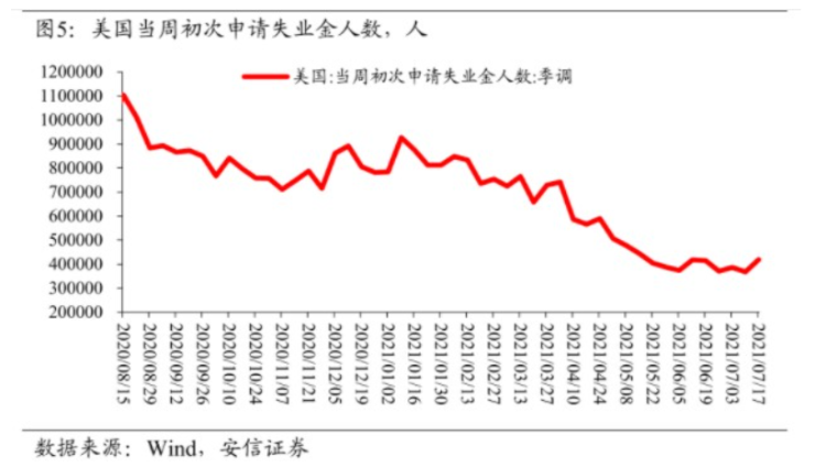 美国当周(7月17日)初次申请失业金人数41.9万人(预期35万人),较前值回升5.1万人。自6月以来,申请人数的下行态势趋缓、且围绕40万人中枢波动,较疫情前平均水平高出约20万人,显示出美国劳动力市场复苏节奏并不稳定。