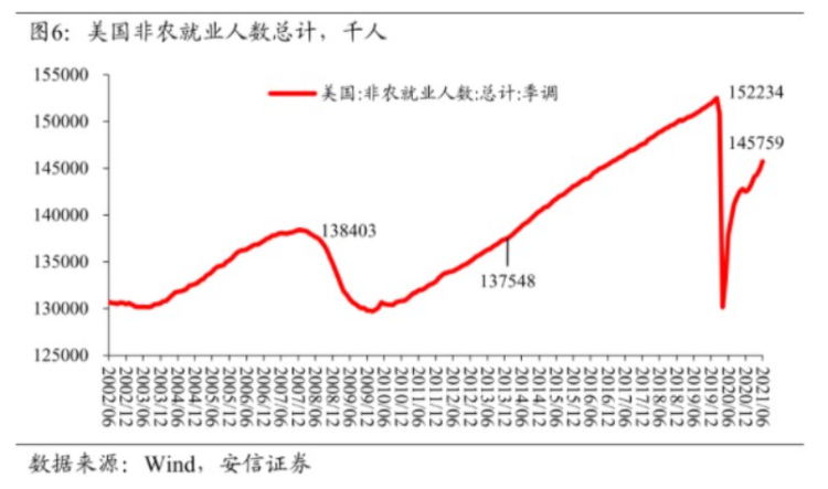 并且以中国在疫情后期经济恢复的均衡位置为参考,若未来美国经济复苏后的均衡位置也同样低于疫情前水平,则相应的就业人数也会降低。考虑到疫情反复、财政补贴、供应链等对劳动力市场造成的扭曲在短期内难以完全消失,未来美联储对就业缺口的容忍程度预计上升,美联储货币政策的正常化可能会晚于此前市场的预期。