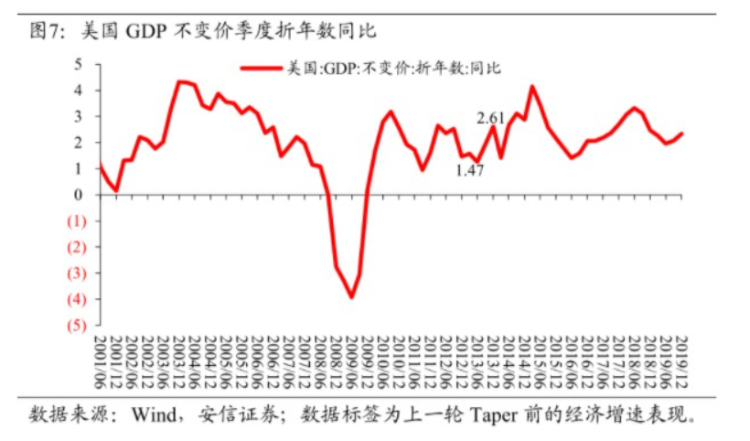 以上一轮美联储Taper所面临的经济增长、就业和通胀情况作为比较,2014年初时美国非农就业总人数基本与金融危机前的高点相近,就业缺口在100万人左右。与此同时,核心PCE同比在1.6%上下。彼时美联储并无通胀掣肘,且2013年全年美国经济的持续恢复为触发Taper提供了关键前提。而今年以来美联储议息会议纪要多次提到的“需要观察到实质性的经济进展,才会考虑政策变动”的表述也与上一轮Taper时一致。