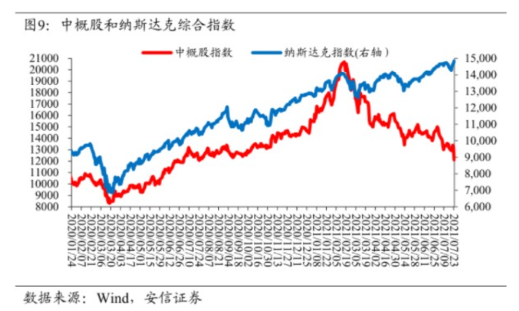 而受到国内监管政策落地影响的中概股,尤其是教育板块,股价则出现了断崖式下跌。随着“双减”政策的出台,尽管其前期只在少数城市试点,但不同于消费倾向等周期性的变化,这一政策调整或与房地产领域类似,预计将对教育行业的格局和生态产生长期影响,因而在估值层面也会出现相应调整,这一调整可能是中长期的。