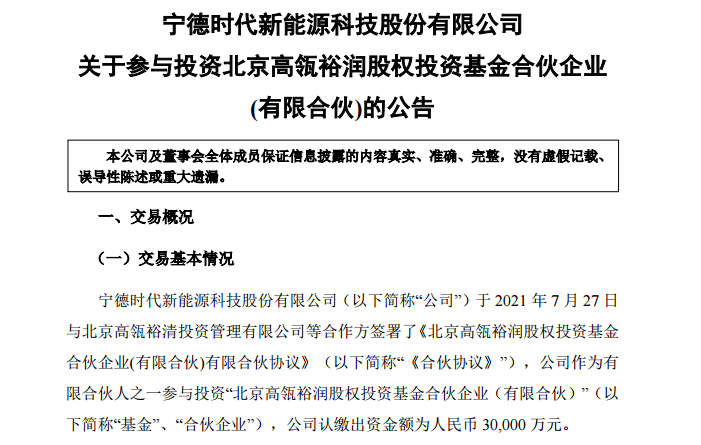 一路高歌猛进的万亿锂电池巨头,宁德时代,昨日发布重磅公告,与张磊的高瓴创投的股权基金签署协议,认缴出资金额3亿元,投资于前沿科技、芯片、半导体、太阳能、电池、智能驾驶、AI 技术、智能终端等科技产业领域。