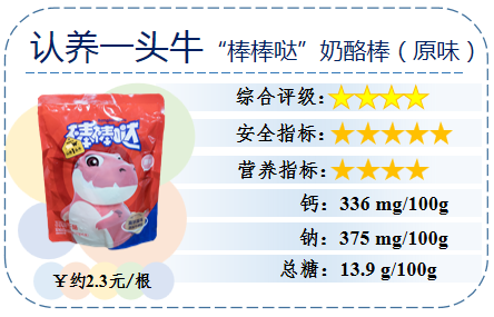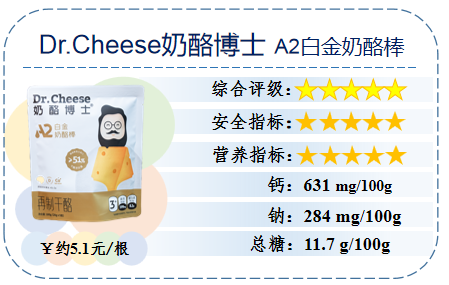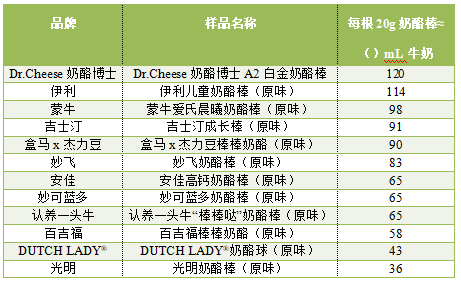 Dr.Cheese奶酪博士、伊利、蒙牛品牌的奶酪棒样品钙含量表现突出。以钙含量最高的奶酪棒为例,每根奶酪棒钙含量≈120mL牛奶的钙含量。