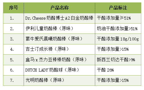 7款奶酪棒已经有标注干酪含量,便于消费者认知和选购产品。