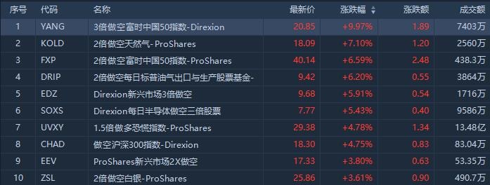 ETF涨幅榜方面,追踪亚太地区中国股票的做空ETF持续大涨,涨幅居前的是3倍做空富时中国50指数涨近10%,成交额7403万美元,两日累计涨近30%;2倍做空富时中国50指数ETF涨6.59%。