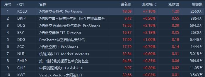 能源ETF涨幅榜方面,2倍做空每日标普油气出口与生产ETF涨6.2%,成交额3684万美元;2倍做空能源ETF涨2.18%,成交额2630万美元。