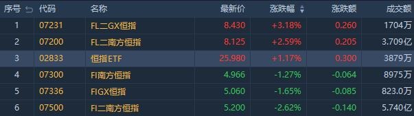 涨幅居前的是南方两倍看多恒指(07200.HK)涨2.59%,成交额3.71亿港元。