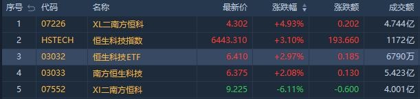 看多恒指相关ETF反弹,南方两倍做多恒科(07226.HK)涨4.93%,成交额4.74亿港元;