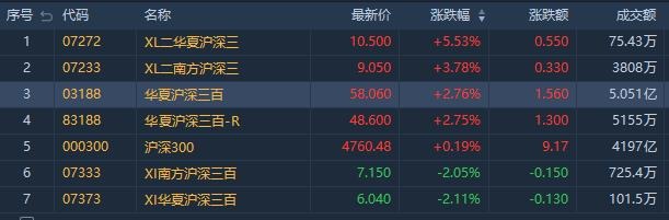 沪深300指数收涨0.19%。其中,华夏沪深三百-R(83188.HK)涨2.75%,成交额5155万港元;华夏沪深三百ETF(03188.HK)涨2.76%,成交额5.05亿港元。