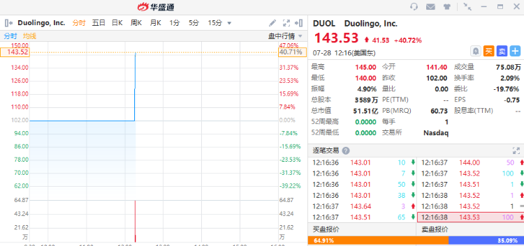 华盛资讯7月28日消息,在线和移动语言学习平台多邻国(DUOL)今晚在纳斯达克上市,上市首日开涨近40%,报142美元,发行价102美元。截至发稿,该股上涨40.72%。