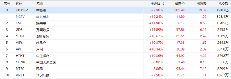 华盛资讯7月28日消息,美股早盘,热门中概股多数走高,第九城市(NCTY)涨超13%,好未来(TAL)涨近12%,满帮(YMM)涨12.5%,万国数据(GDS)涨超10%,唯品会(VIPS)、BOSS直聘(BZ)涨超9%。