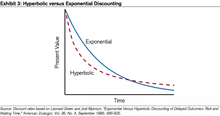 • 为了将未来的价值转换到今天的标准或者反过来转换,常规经济理论假定了一个统一的贴现率。然而,人们常给短期假设一个较高的贴现率,而对于长期转换则设定得较低。这或许是因为我们司掌长短期决策的大脑区域是不同的。