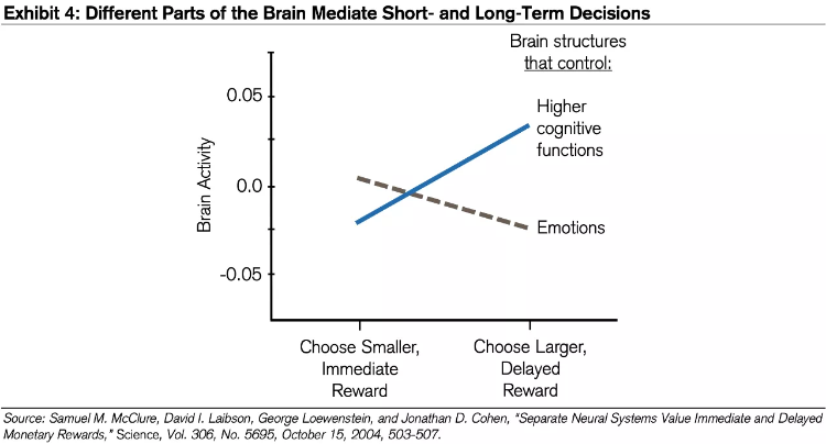 研究员调查了关于短期与长期收益和大脑活动的关联,他们发现此二者分别由大脑两个不同区域调节与负责。边缘结构负责司掌当奖励相对较小并且相对短期时的决策,它也和冲动行为、功能紊乱甚至瘾性行为有关。而当更为大价值并且相对更长期的奖励加入了成为了可选项之一时,前额叶与顶叶皮质开始变得活跃,而这部分大脑也和主观加工和认知掌控有关。因此,根据选项性质的不同,负责处理的神经系统也会有所不同。