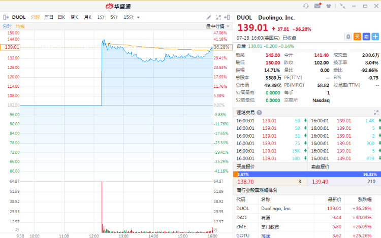 在线和移动语言学习平台多邻国(Duolingo,Inc.,股票代码DUOL)周三正式登陆纳斯达克,开盘涨超37%,IPO价格为102美元,盘中最高触及145美元。