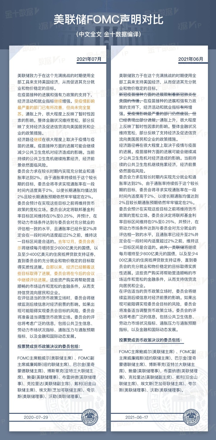 关于经济观点,声明称美国经济已经朝着缩减量化宽松的目标取得了进展,经济活动和就业形势继续增强,但受疫情影响的行业还没有完全复苏。