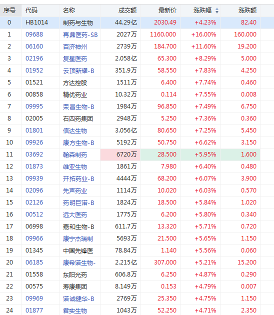 医药股集体爆发,再鼎医药涨16%,爱康医疗涨13%,京东健康涨12%,复星医药涨8%,百济神州涨11%,阿里健康涨超9%。