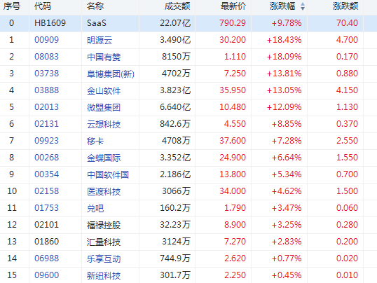 华盛资讯7月29日消息,SaaS板块普涨,截止发稿,中国有赞、明源云上涨18%;金山软件、微盟集团涨超13%;云想科技涨8%;移卡涨7%;金蝶国际涨6%,医渡科技涨4%。