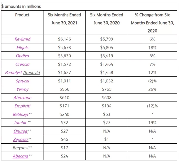 7月28日,百时美施贵宝(BMS)公布2021Q2业绩,上半年总收入227.76亿美元,同比增长9%,其中Q2营收117.03亿美元,同比增长16%。