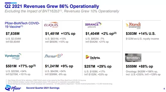 从具体产品表现来看,新冠肺炎的全球大流行促使辉瑞和BioNTech合作的新冠疫苗持续放量,成为辉瑞销量最高的产品,第二季度销售收入达到78亿美元,上半年累计销售额113亿美元,预计全年将实现约335亿美元的收入。