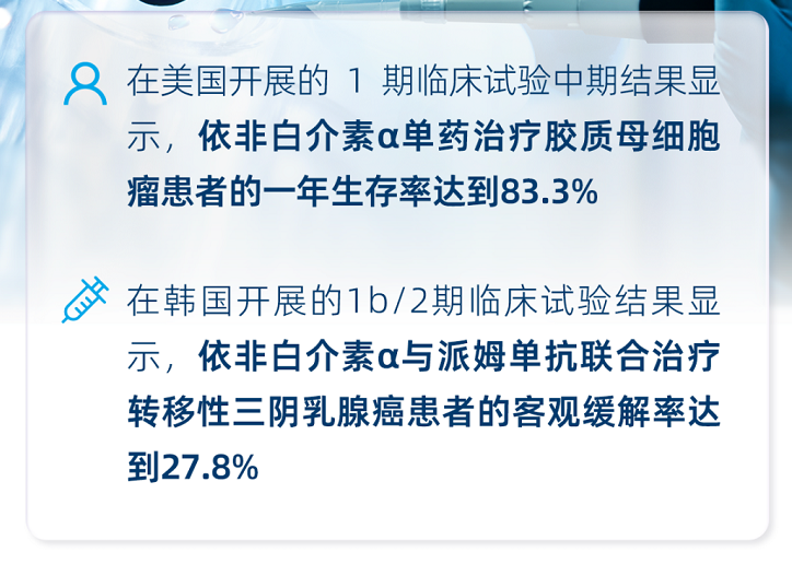依非白介素α是全球首个也是唯一一个长效重组人白细胞介素7(rhIL-7)药物,多项临床前及临床研究显示依非白介素α通过促进T淋巴细胞增殖有效地提升T淋巴细胞数量及功能,可用于治疗肿瘤伴随性淋巴细胞减少症及联合免疫检查点抑制剂(如PD-1抗体)通过协同效应治疗肿瘤。