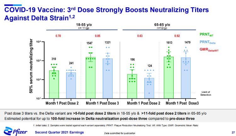 辉瑞和BioNTech进行的临床试验的初步数据显示,针对受到广泛关注的Delta变种,接种第三剂疫苗后,中和抗体滴度在18-55岁成人中提高5倍以上,在65-80岁老年人中提高11倍以上。