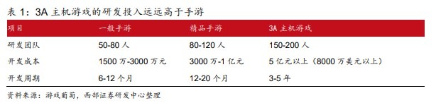 3A游戏的研发投入远远高于手游,不少手游公司都表示没必要投入制作做“类 3A”的大制作游戏,因为“不赚钱”。据西部证券测算,目前阶段精品手游的 ROI 确实远高于海外3A游戏。
