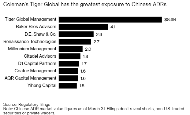 截至3月31日,老虎环球持有价值86亿美元的中国公司的美国存托凭证(ADR),在公开披露此类持仓的340家对冲基金中位居榜首。备案文件显示,这些ADR截至周三的价值约为64亿美元。披露的信息不包括空头头寸和非美国市场的证券交易。