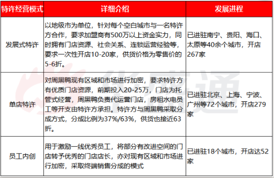 所谓特许经营,其实就是以加盟的方式来进行合作。周黑鸭通过发展式特许、单店特许、员工内创三种模式覆盖不同市场,三种模式互为补充,与自营模式相辅相成,共同推进周黑鸭新市场的拓展及成熟市场的渗透。