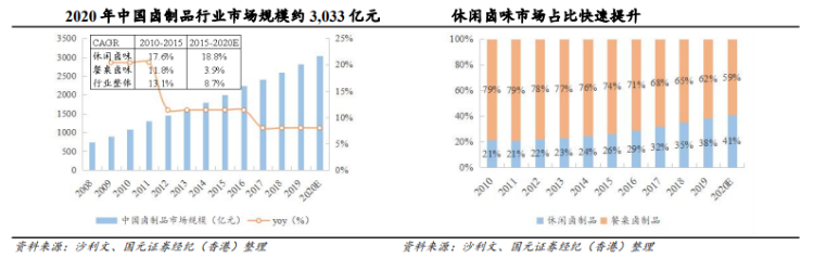 从市场规模来看,截至2020年中国与卤制食品相关的市场规模已经超过3000亿元,而休闲卤味制品市场规模也在1235亿元左右,且占比呈逐年提高的态势。