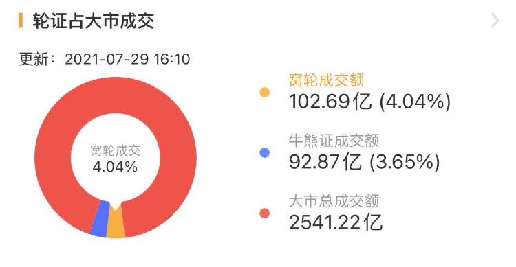 其中,窝轮总成交102.69亿港元,牛熊证总成交92.87亿港元。