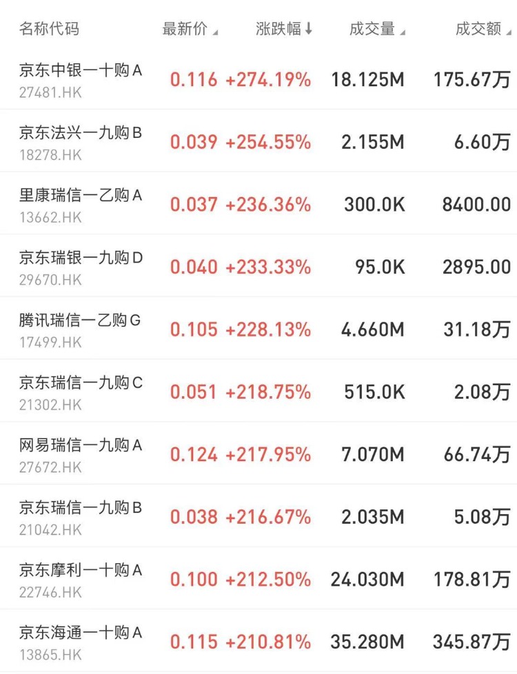 涨幅居前的包括: $27481.HK 京东中银—十购A暴涨274.19%,占据排行榜第一; $18278.HK 京东法兴—九购B涨254.55%; $13662.HK 里康瑞信—乙购A涨236.36%。