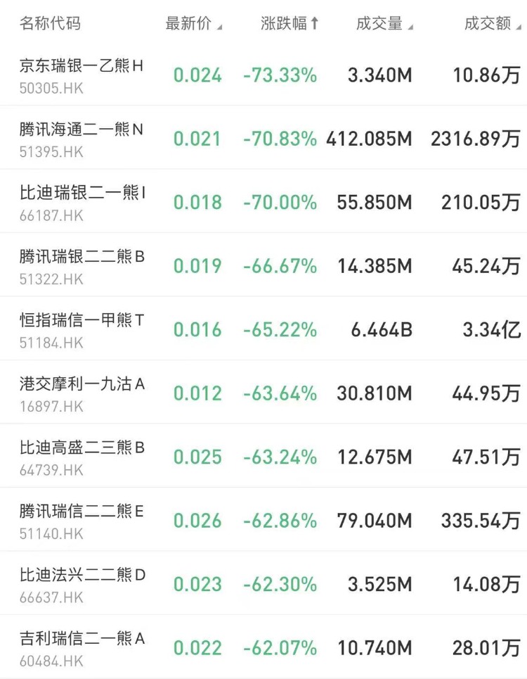 在今日跌幅榜中, $50305.HK 京东瑞银—乙熊H 跌73.33%; $51395.HK 腾讯海通二一熊N跌70.83%。