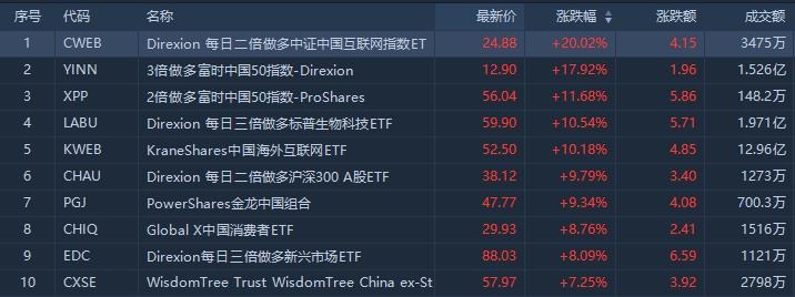 ETF涨幅榜方面,涨幅居前的是每日二倍做多中证中国互联网指数ETF大涨20%,成交额3475万美元;3倍做多富时中国50指数ETF涨17.92%,成交额1.53亿美元,