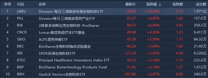 能源ETF涨幅榜方面,每日三倍做多标普生物技术ETF涨10.54%,成交额1.97亿美元。每日三倍做多医药产业ETF涨6.85%,成交额157万美元。