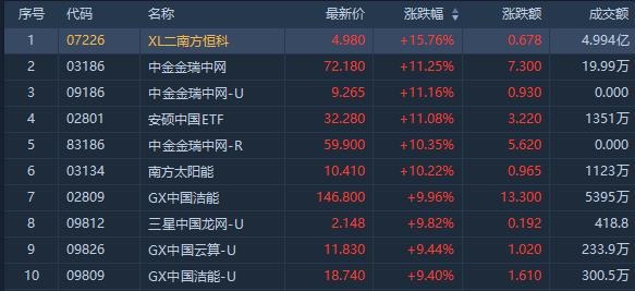 今日涨幅位居前的ETF有南方两倍做多恒科暴涨15.76%,成交额4.99亿港元;南方太阳能ETF涨10.22%,成交额1123万港元。
