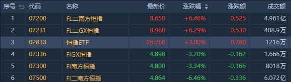 涨幅居前的是南方两倍看多恒指(07200.HK)涨6.46%,成交额4.96亿港元。