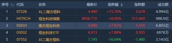 看多恒指相关ETF继续反弹,南方两倍做多恒科(07226.HK)涨15.76%,成交额4.99亿港元;