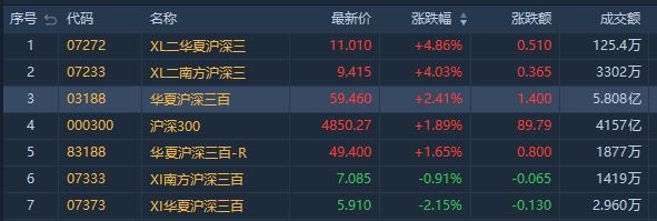 沪深300指数收涨1.89%。其中,华夏沪深三百-R(83188.HK)涨1.65%,成交额1877万港元;华夏沪深三百ETF(03188.HK)涨2.41%,成交额5.81亿港元。