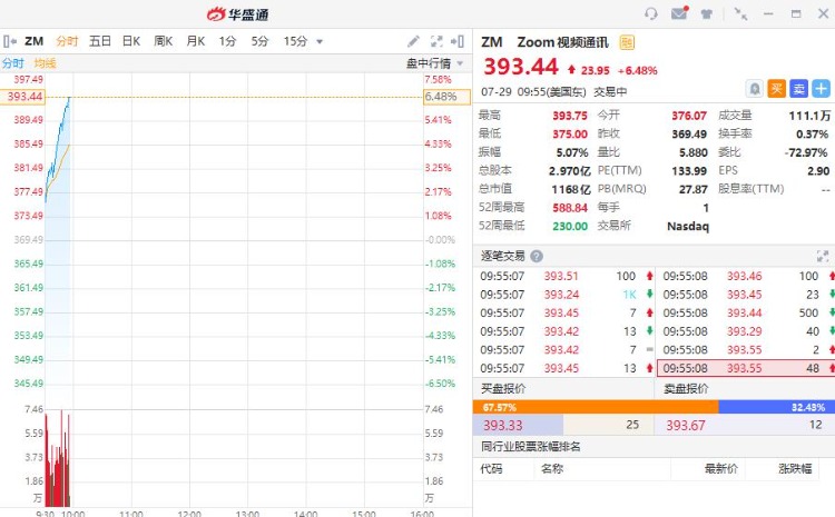 截至21:56,Zoom美股早盘涨6.48%,报393.44美元。
