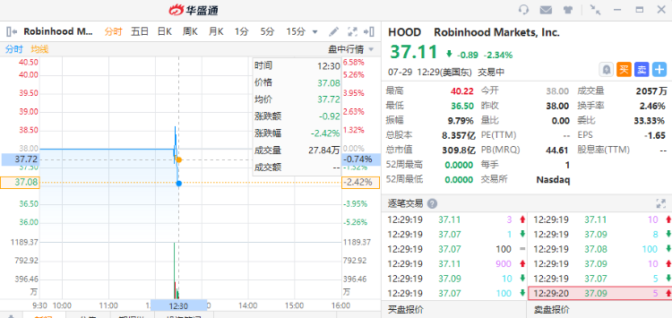 华盛资讯7月29日消息,全球最大的免佣美股券商Robinhood(HOOD)今晚在纳斯达克上市,上市首日破发后迅速转涨,又再度转跌。截至发稿,该股跌2.34%,报37.11美元/股。
