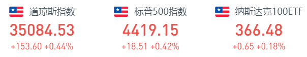 7月29日周四收盘,道琼斯指数上涨153.60点,涨幅0.44%,报35084.53点,盘中再次刷新历史新高;标普500指数上涨18.51点,涨幅0.42%,报4419.15点,盘中亦刷新历史新高;纳斯达克综合指数上涨15.68点,涨幅0.11%,报1778.26点。