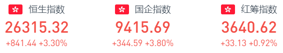 7月29日周四港股收盘,恒生指数继续大幅反弹上涨3.30%或841.44点,报26315.32点。国企指数反弹3.80%或344.59点,报9415.69点,红筹指数反弹0.92%或33.13点,报3640.62点。