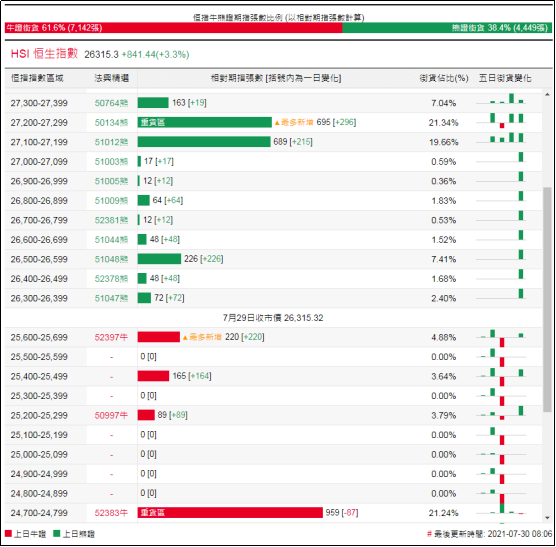 街货分布方面,至周四,恒指牛证街货在收回价24600点至25300点之间,相当约1763张期指合约;恒指熊证街货主要贴价区间在收回价26800点至27300点之间,累计相当约1477张期指合约。