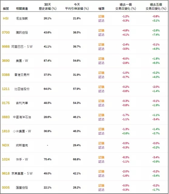 周四恒指相关权证的平均引伸波幅报约21.8%,按日下调1.4个百分点。个股方面,大部分个股相关引申波幅均有所下调,其中,腾讯、美团、快手相关认购证引申波幅下调更明显。