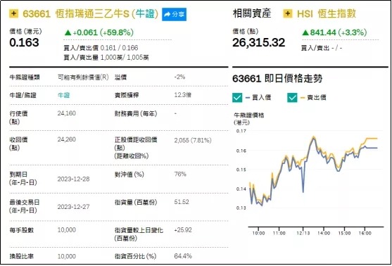 1、强势轮证:恒指瑞通三乙牛(63661.HK),周四大涨59.8%;