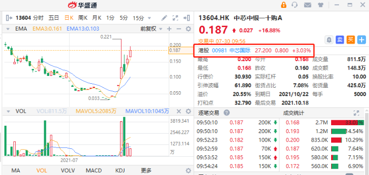 相关涡轮方面, $13604.HK 中芯中银一十购A涨近17%,其行使价为30.93港元,到期日为2021年10月22日,溢价20.55%。