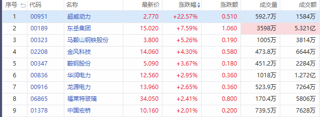 华盛资讯7月30日消息,早盘碳中和概念股持续走强,截止发稿,超威动力上涨22.57%;东岳集团上涨7.59%;马鞍山钢铁股份上涨5.26%;金风科技上涨4.30%;鞍钢股份上涨3.67%;华润电力上涨2.95%;龙源电力上涨2.65%;福莱特玻璃上涨3.31%;中国宏桥上涨2.01%。