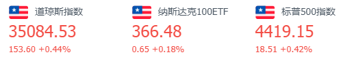 道指涨153.60点,或0.44%,报35084.53点;纳指涨15.68点,或0.11%,报14778.26点;标普500指数涨18.51点,或0.42%,报4419.15点。