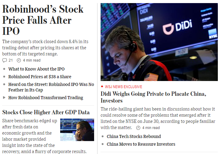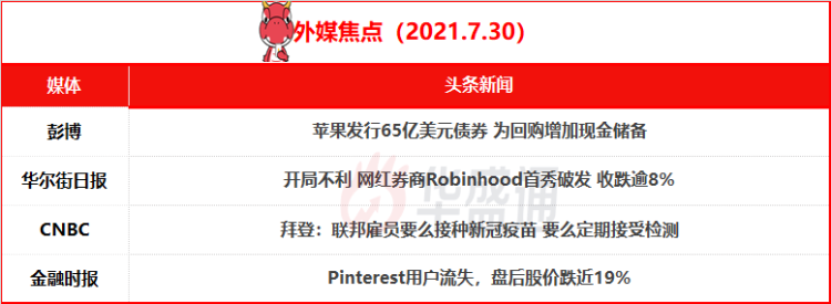 美股周四收高,道指与标普500指数均创盘中历史新高。美国二季度GDP增幅不及预期,分析师认为这意味着美联储不会立即退出宽松政策。市场专注于基本乐观的企业财报。美国在线券商罗宾汉上市首日破发。