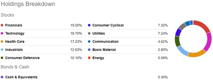 DGRO投资于多元化的成长股和高红利价值股,与SCHD一样,这只ETF按行业划分权重也相对均衡,金融和科技股是重点板块。